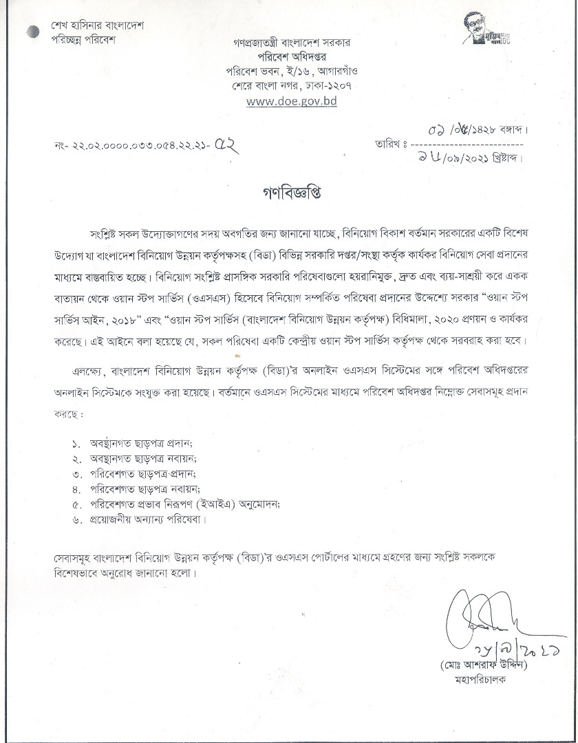 | পরিবেশ অধিদপ্তরের ছাড়পত্র গ্রহণ সংক্রান্ত গণবিজ্ঞপ্তি | ০২ মার্চ ২০২২ | Download |