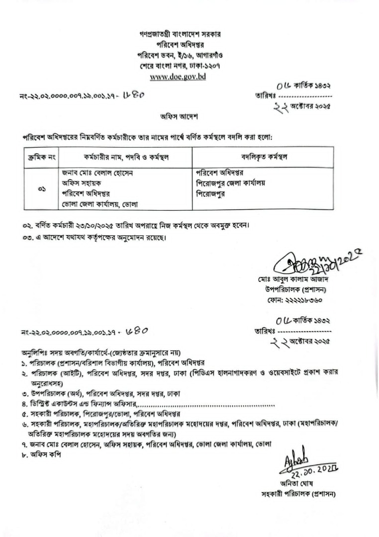 | বদলি আদেশ (অফিস সহায়ক) | ২২ অক্টবার ২০২৫ | Download |