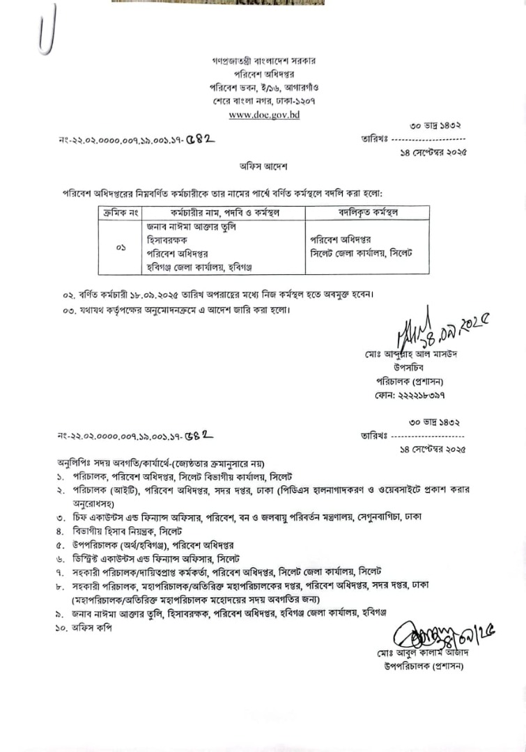 | বদলি আদেশ (উচ্চমান সহকারী) | ১১ সেপ্টেম্বর ২০২৫ | Download |